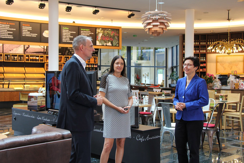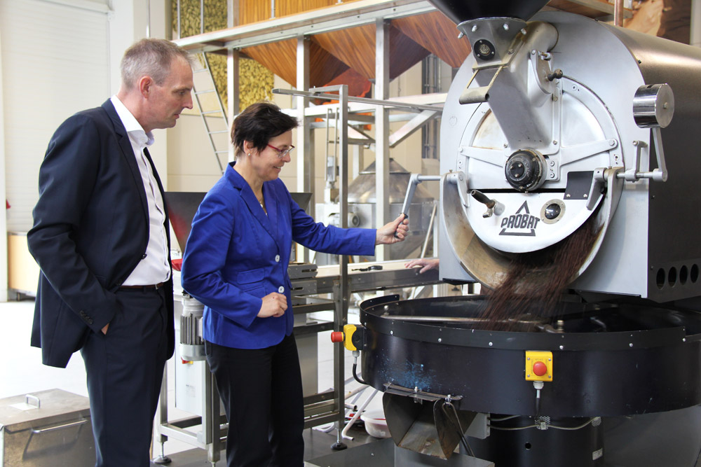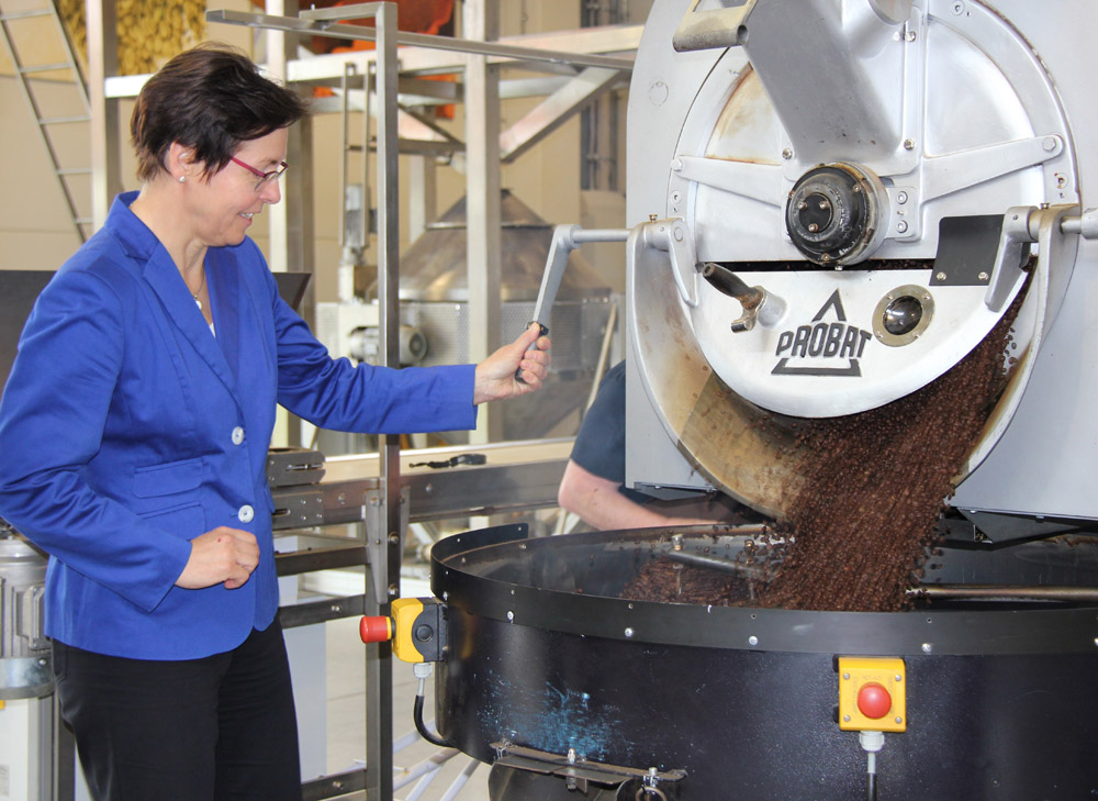 Frau Taubert ließ sich ausführlich über die Produktionsprozesse im Ladenbau und der Kaffeerösterei informieren und war fasziniert von der Produktionstiefe und der Innovationskraft der Firma Freund.