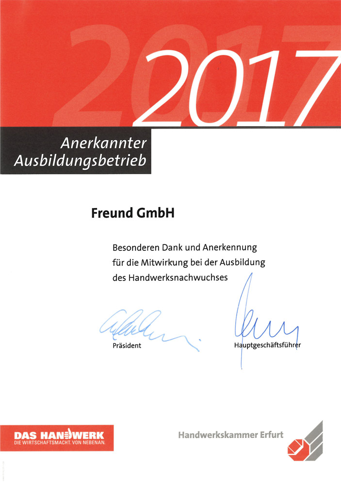 Seit 25 Jahren engagieren wir uns für die nachhaltige Sicherung des Fachkräftenachwuchses in unserer Region. Als Zeichen der Anerkennung bedankte sich die Handwerkskammer Erfurt bei uns auch für 2017 mit der Urkunde „Anerkannter Ausbildungsbetrieb“.
