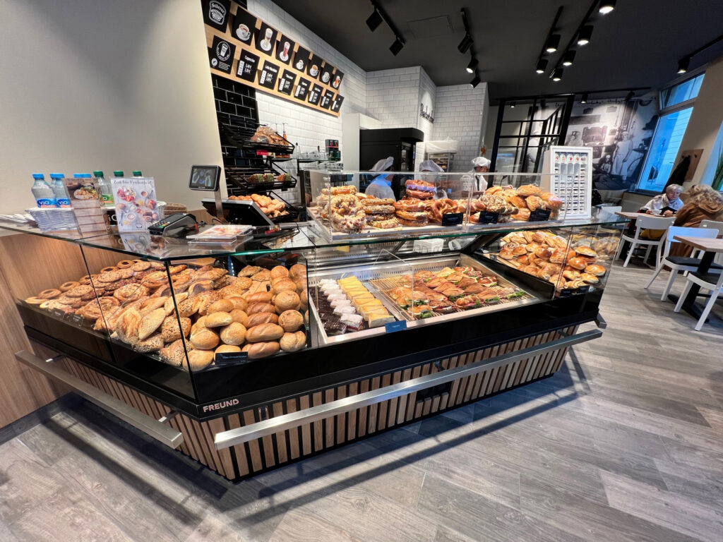 Durch die Thekenkonstruktion mit Glasaufsatz wird eine optimale Warenpräsentation gewährleistet und die Kunden erhalten durch den gläsernen Bäckerarbeitsplatz einen Einblick in die Zubereitung der Backwaren.