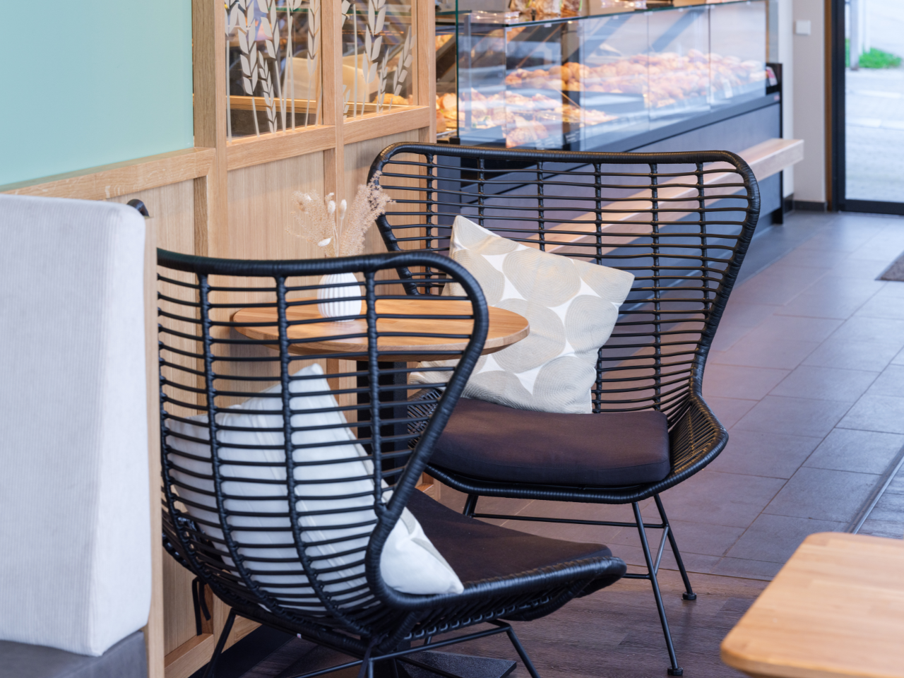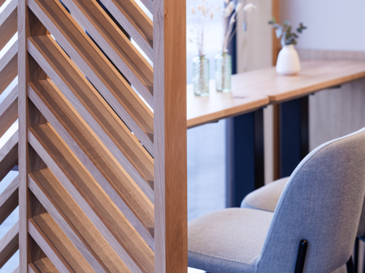 Der Café-Bereich ist ein großer Wohlfühlraum, in dem die perfekte Balance aus sanften Naturtönen und lebendigen Farbakzenten gelingt. Besonderes Highlight sind unsere individuell gefertigten Raumtrenner in Fischgrät-Optik: Blickfang und gleichzeitig Blickschutz.