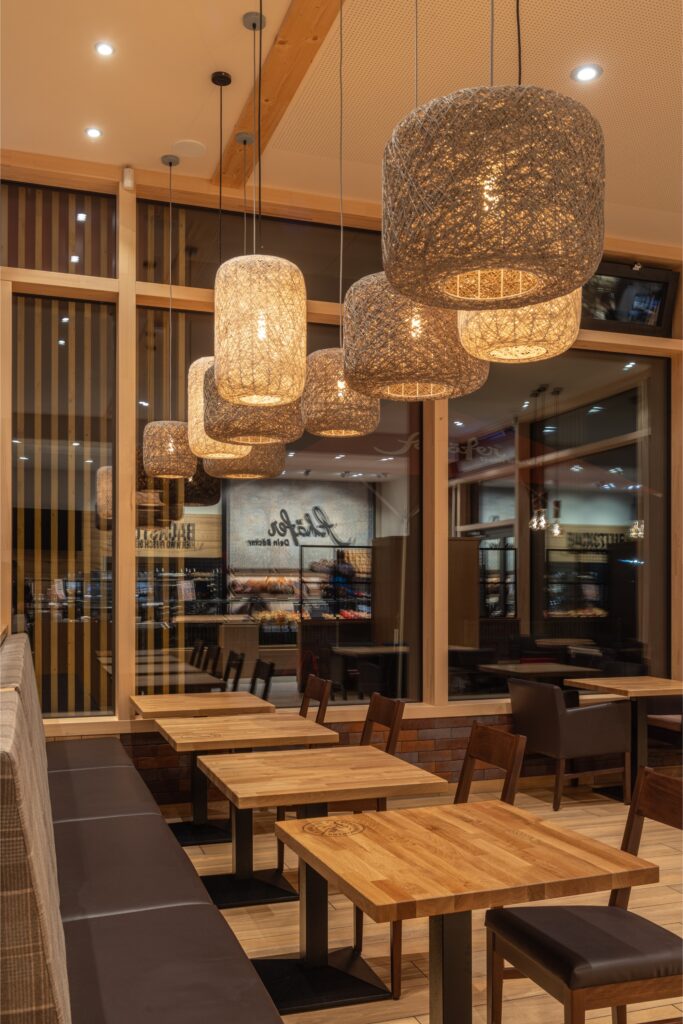 - Die Kombination aus massiver Eiche, warmen Stoffen und Lampen aus natürlichen Materialien ist nicht nur gemütlich, sie steht auch für Qualität & traditionsreiches Backhandwerk.