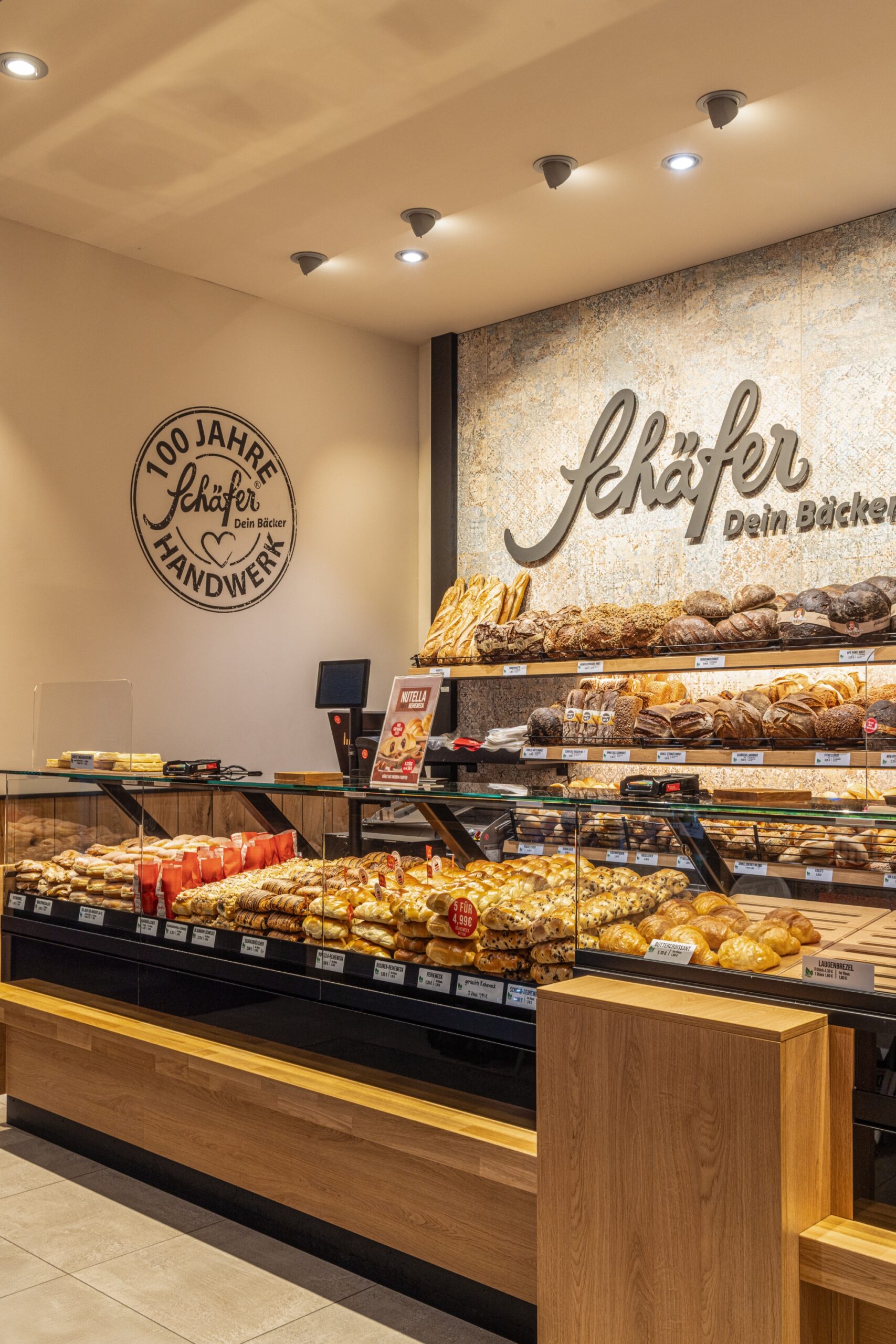 - Die markante Theke und das auffällig gestaltete Brotregal bilden das Herzstück der Filialen.