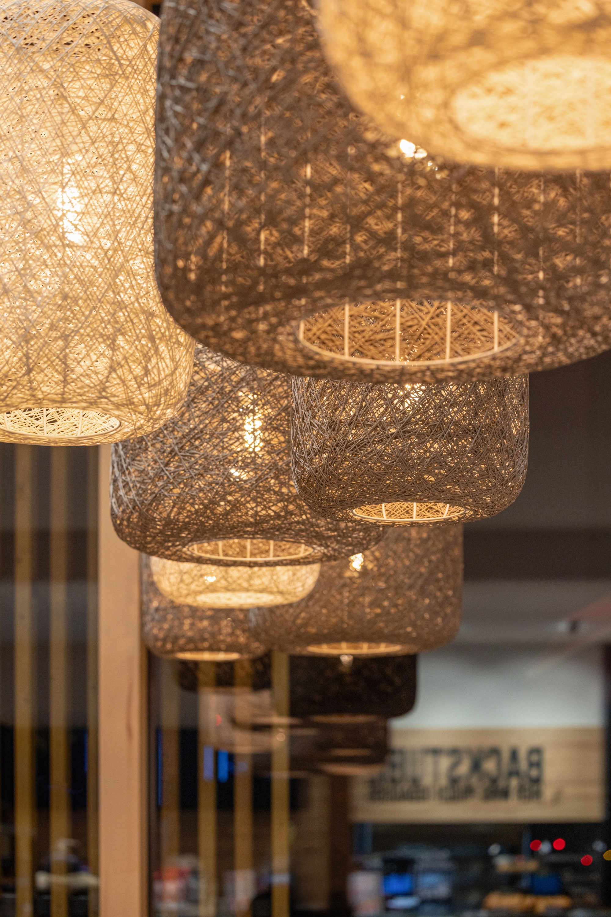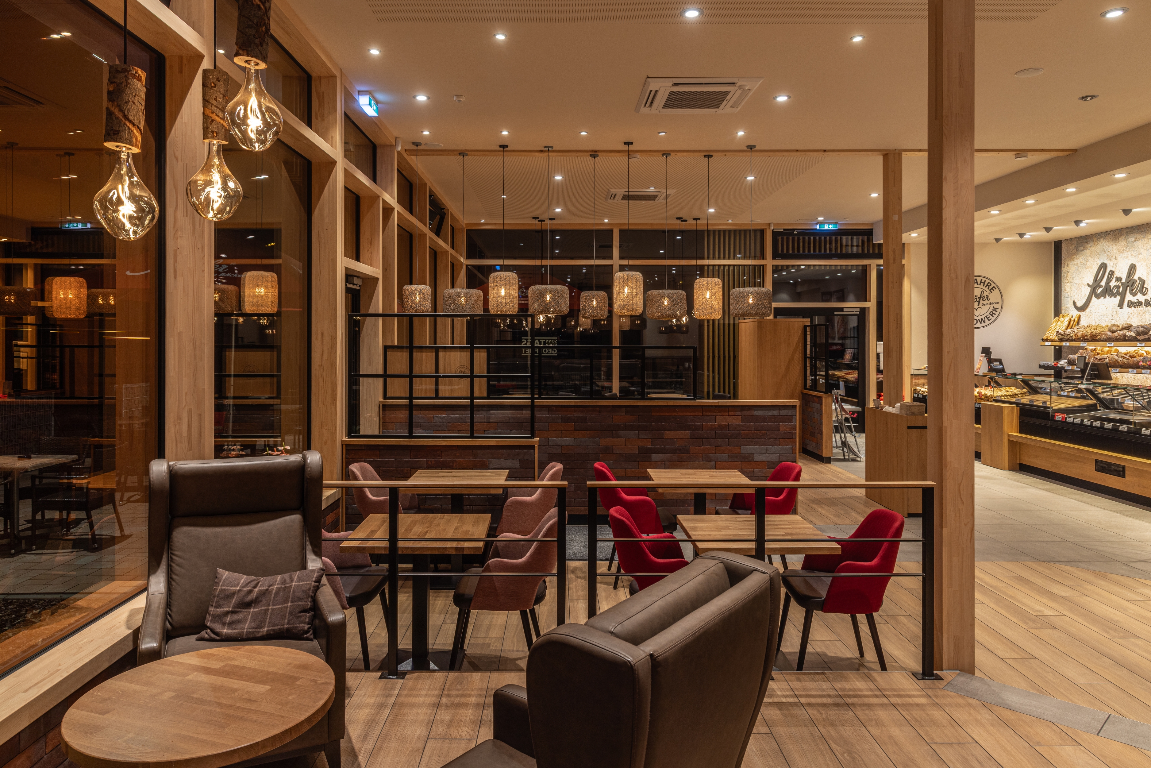 - Die Kombination aus massiver Eiche, warmen Stoffen und Lampen aus natürlichen Materialien ist nicht nur gemütlich, sie steht auch für Qualität & traditionsreiches Backhandwerk.