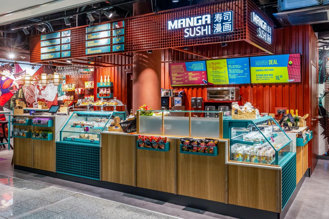 Bei Manga Sushi trifft die ruhige Ästhetik der Sushi-Meister auf die lebendigen Farben der Manga-Welt. Für Lagardère Travel Retail durften wir das neue Hybridkonzept zum Leben erwecken: