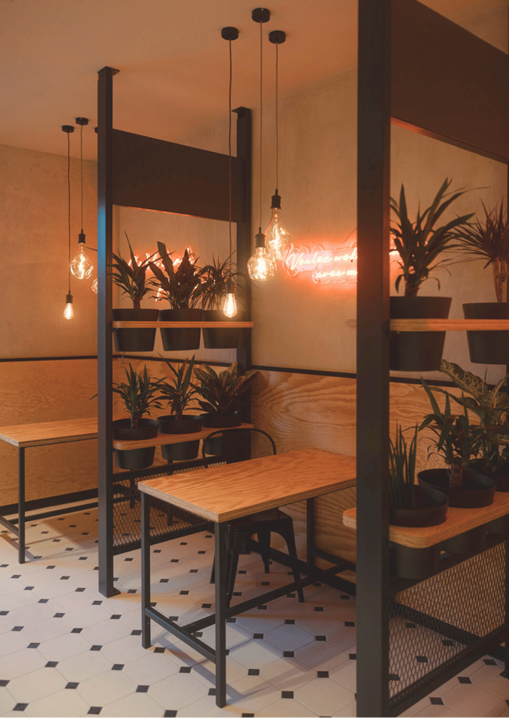 Kombiniert mit schwarz-weißen Bodenfliesen, Metall-Elementen in geschliffenem Kupfer & Anthrazit sowie Neon-Schriftzügen in leuchtendem Ting Ting-Orange ist das Interior gleichzeitig kontrastreich und auf überraschende Art harmonisch.