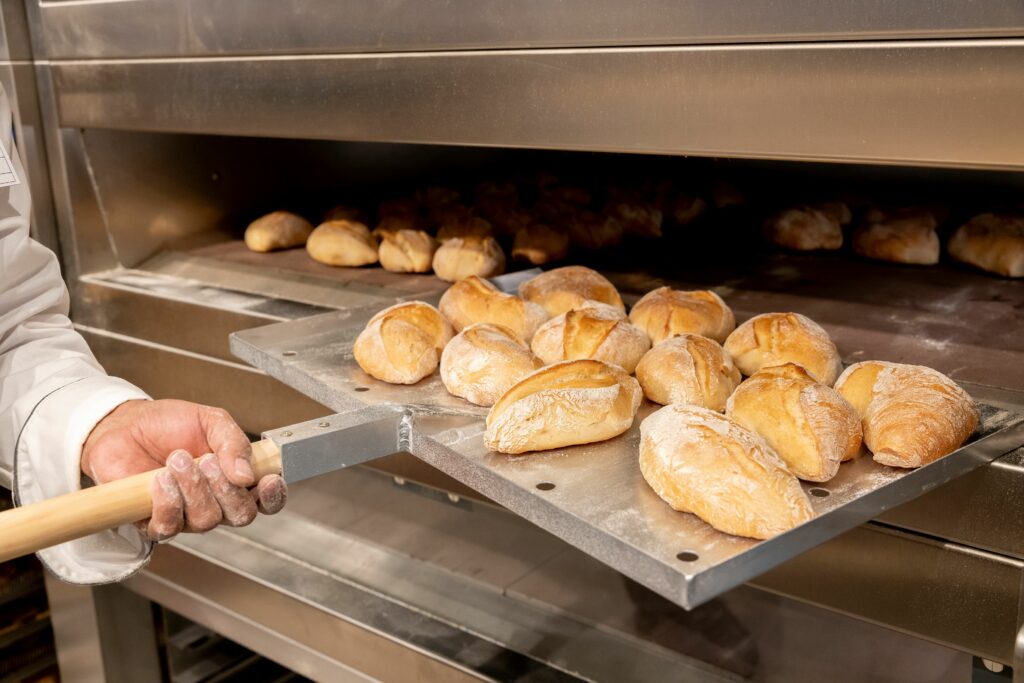 Die großzügige Theke mit ihren hellen Eiche-Lamellen ist nicht nur ein Hingucker, sondern bietet schnellen Überblick über das vielfältige Sortiment. Direkt daneben zeigt die gläserne Backstube echtes Handwerk – und sorgt nonstop für frische Backwaren.