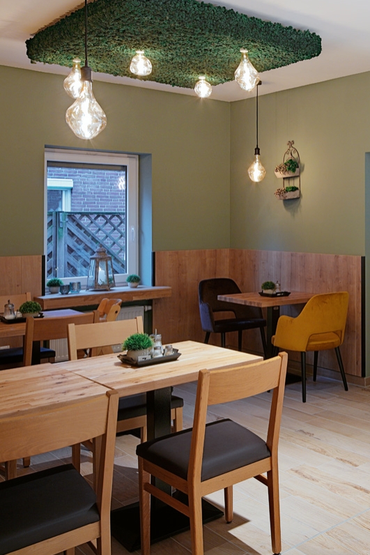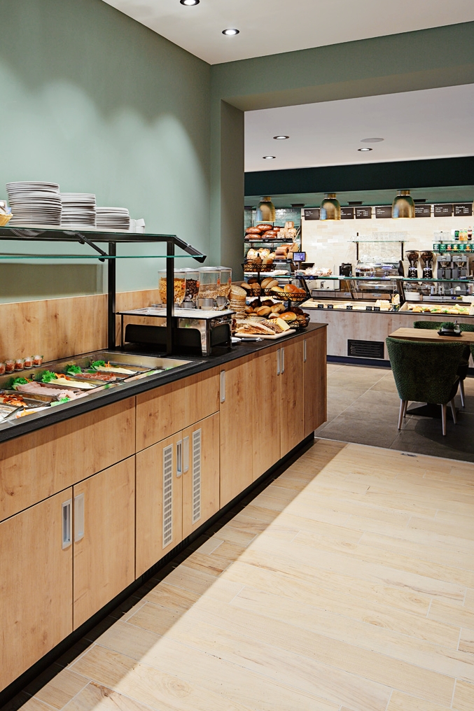 Deckenelemente aus echtem Islandmoos, organisch geformte Leuchten und: ein üppiges Frühstückbuffet mit individuell gestalteter Theke. „Signature-Elemente“ wie diese bleiben in Erinnerung und schaffen als roter – oder besser grüner Faden – eine Verbindung zwischen den einzelnen Filialen des Kunden.